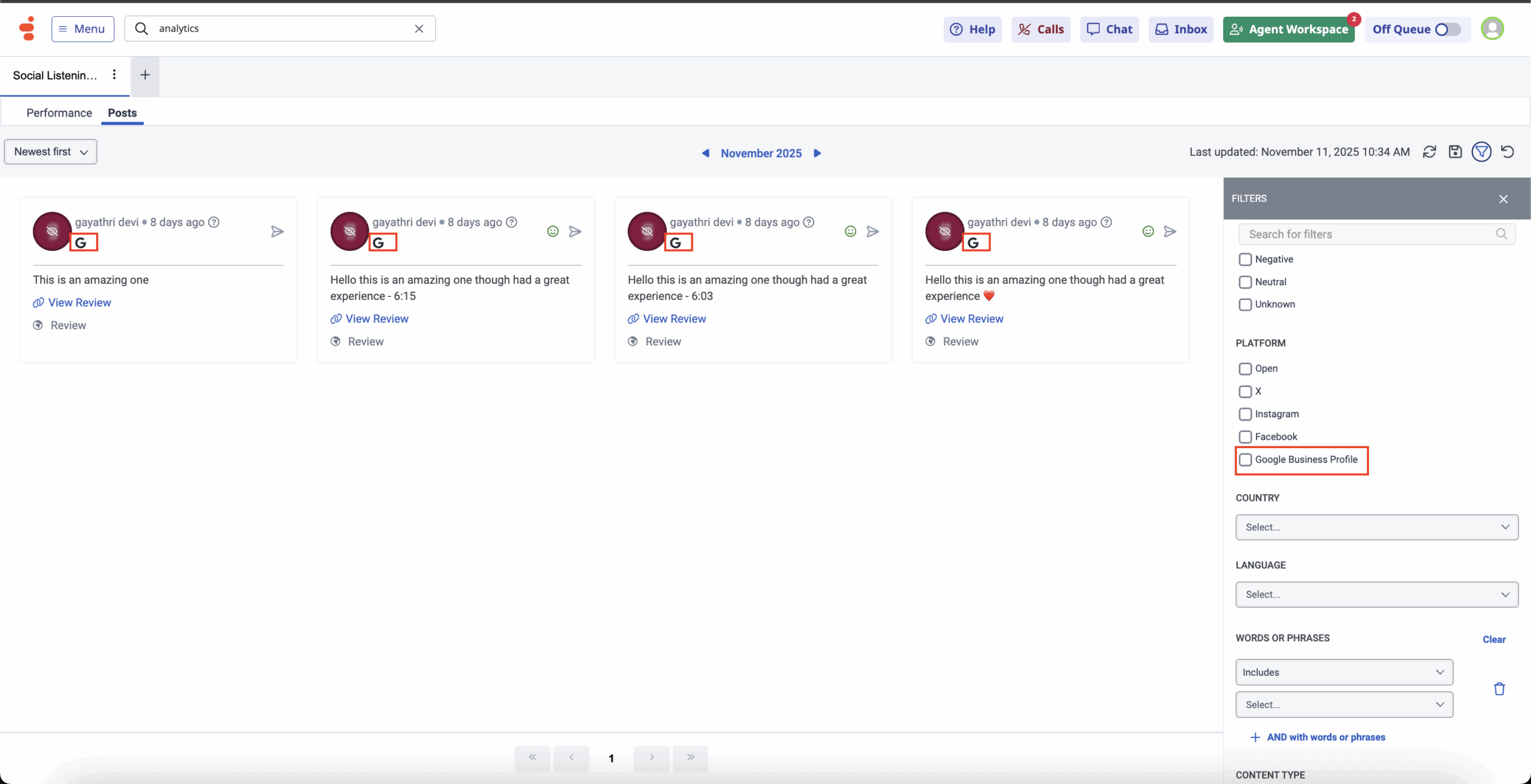 - Visibilité améliorée - Les agents peuvent désormais voir et gérer les interactions du profil Google Business dans le même espace de travail que les autres canaux sociaux.