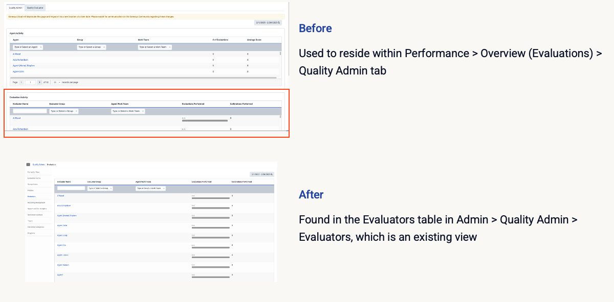 Les six tableaux de données de la page Vue d'ensemble (évaluations) seront toujours disponibles, mais seront déplacés vers des vues différentes dans Genesys Cloud :