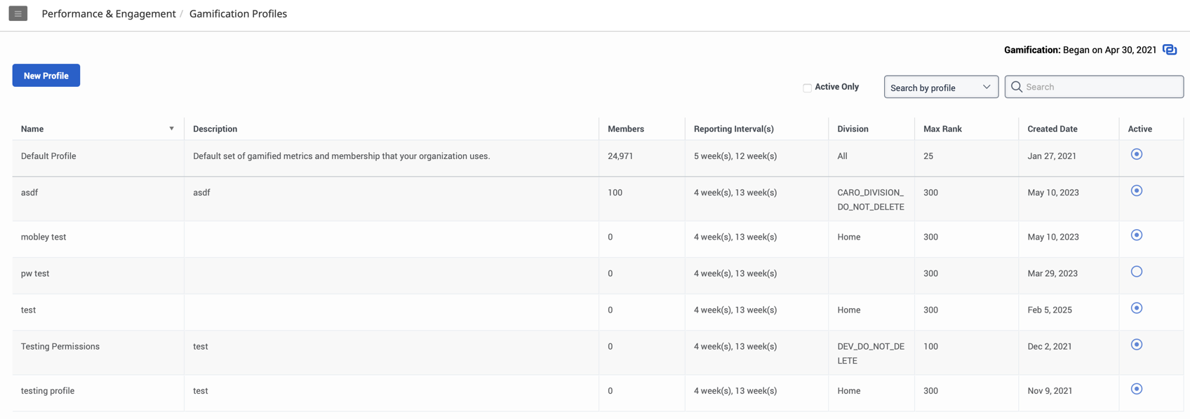 Pour plus d'informations sur la configuration de vos profils, voir Configurer les détails du profil de gamification, Configurer les métriques de profil de gamification, et Gérer les adhésions aux profils.
