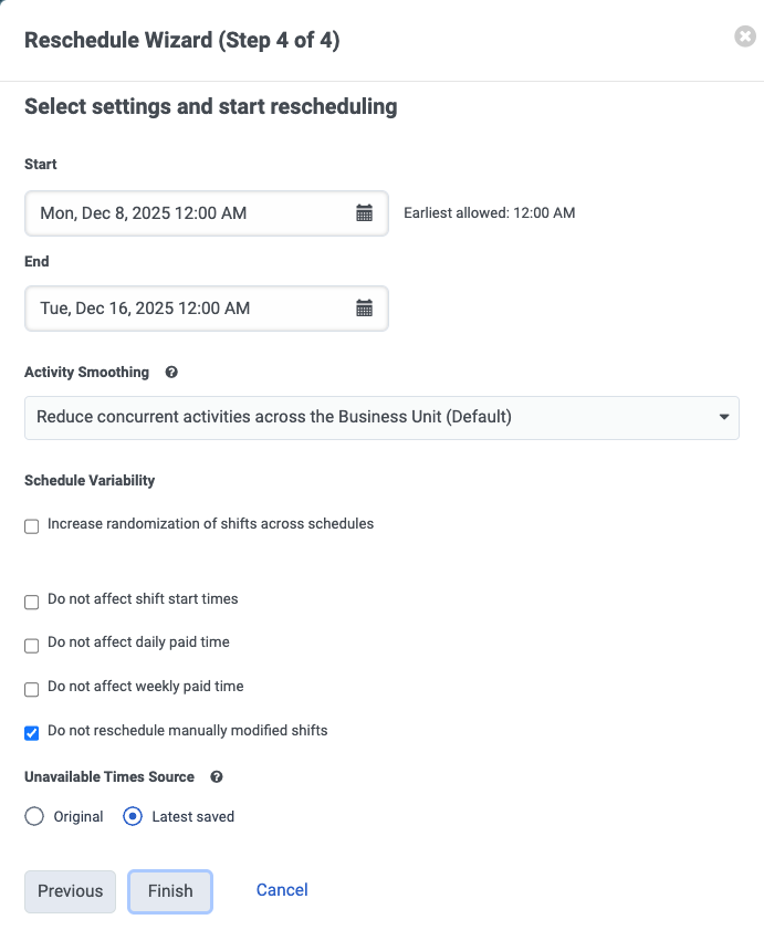 - (Facultatif) Dans le champ Do not reschedule manually modified shifts, indiquez si le nouveau programme à générer peut être créé sans inclure les équipes modifiées manuellement.