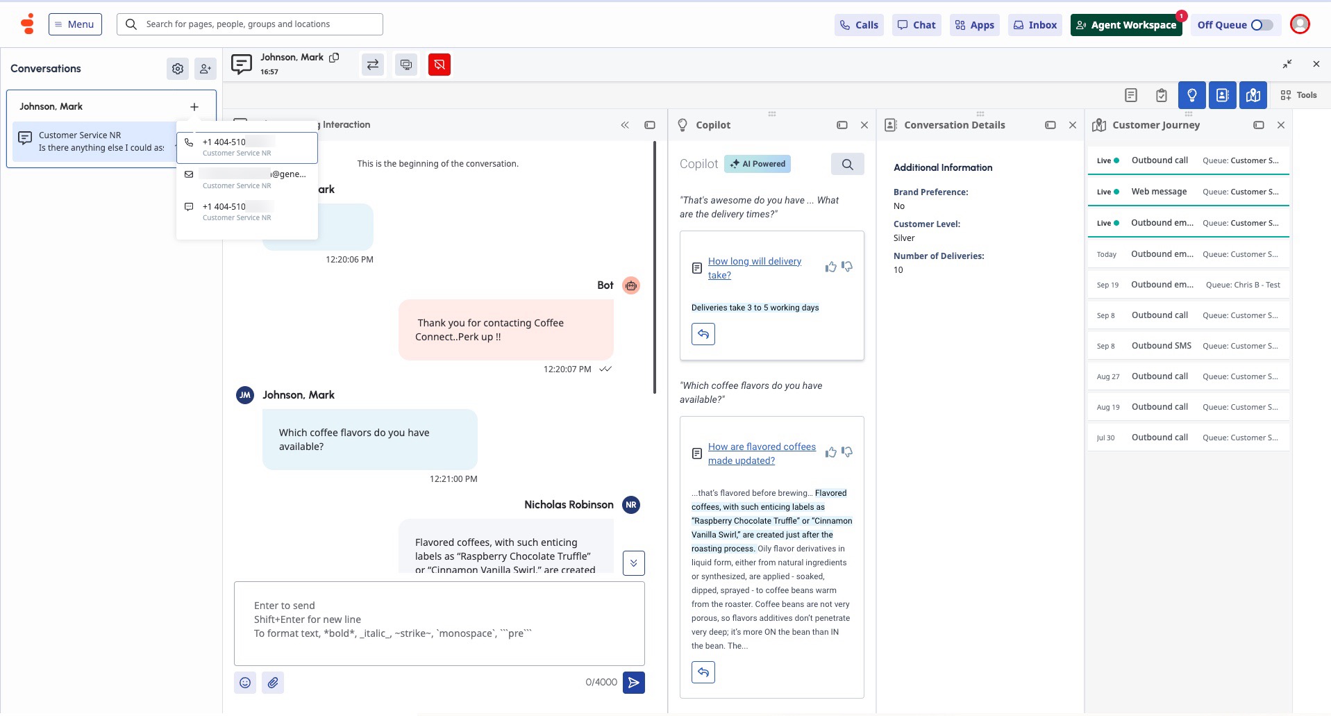 Les nouvelles interactions et les interactions en cours apparaissent sur le côté gauche dans la liste des conversations. Si disponible, Genesys Cloud affiche l'étiquette de division pour le participant à la conversation sur la carte de conversation. Pour répondre, refuser ou afficher une interaction, sélectionnez-la dans la liste. À droite de la liste des conversations, la fenêtre de conversation affiche le nom du contact, le temps écoulé de la conversation, le canal d'interaction et les commandes d'interaction en haut, et le contenu de l'interaction en bas.