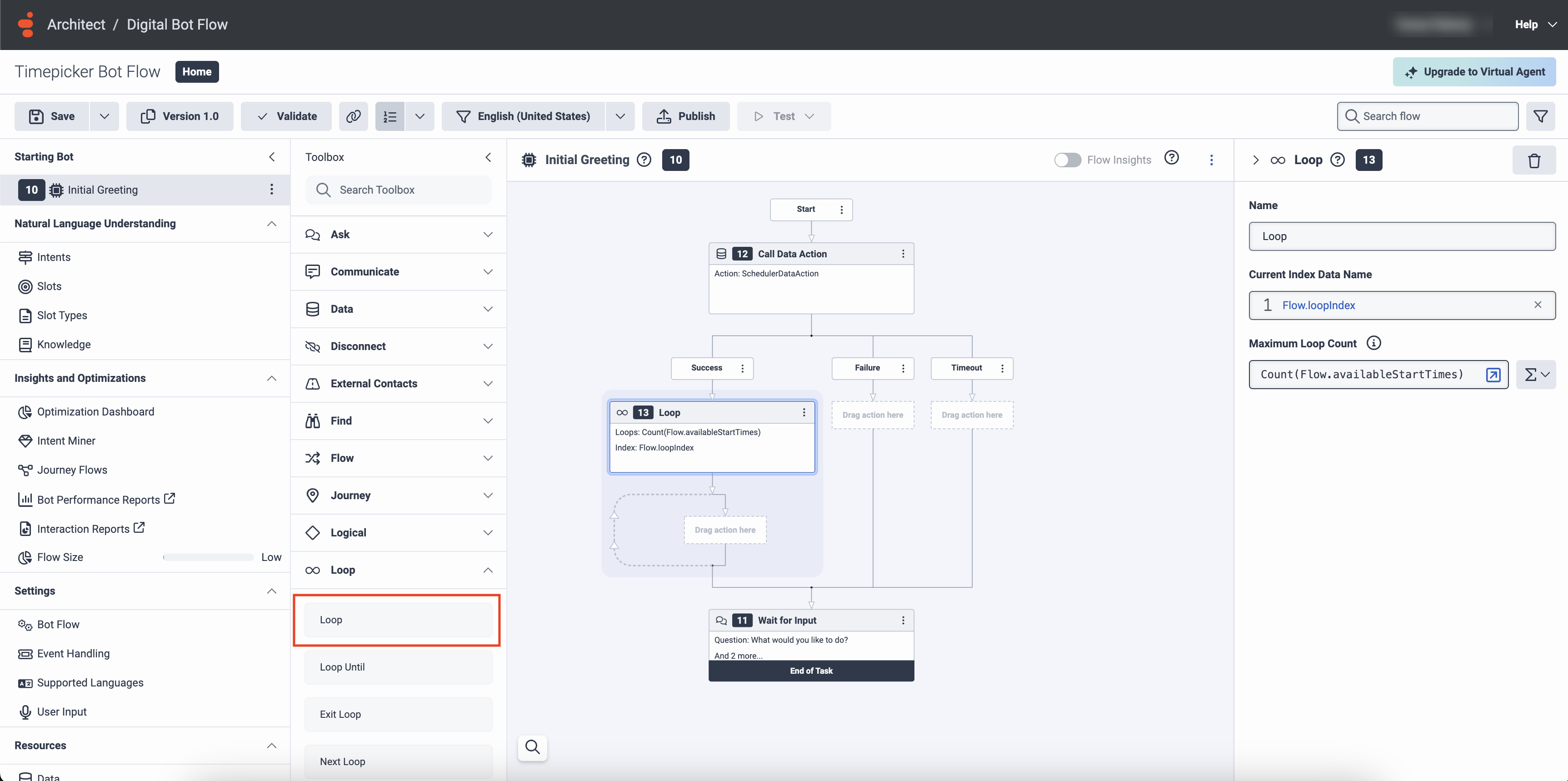 Si la demande adressée à l'API tierce n'aboutit pas, le flux du bot emprunte le chemin Timeout de la page Call Data Action. L'action sur les données peut réussir lors d'une deuxième ou d'une troisième tentative. Pour mettre en place plusieurs tentatives, vous pouvez placer l'action Call Data Action dans une action Loop avec un nombre maximal de boucles assez bas. Veillez à placer également une action Exit Loop après l'action Call Data Action.