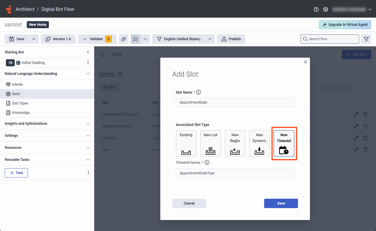 Outre les types de créneaux intégrés, Architect prend en charge cinq types de créneaux personnalisés : le type de créneau de liste, le type de créneau de liste dynamique, le type de créneau d'expression régulière, le créneau temporel et le type de créneau alimenté par l'IA pour l'agent virtuel. Si les données de votre type de créneau personnalisé sont un ensemble de créneaux horaires prédéfinis, utilisez le type de créneau horaire. Les types de créneaux horaires vous permettent de créer un bot qui offre des options de temps que les clients peuvent sélectionner au cours d'une interaction de messagerie. Vous pouvez soit fournir une liste personnalisée de valeurs DateTime, soit utiliser une action Call Data pour récupérer des événements de calendrier auprès d'un fournisseur d'événements de calendrier tiers.