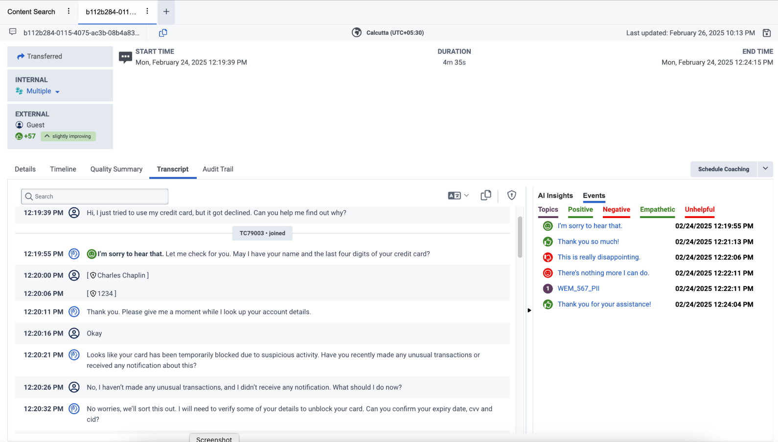 - Cliquez sur l'onglet Transcript et sélectionnez une interaction.